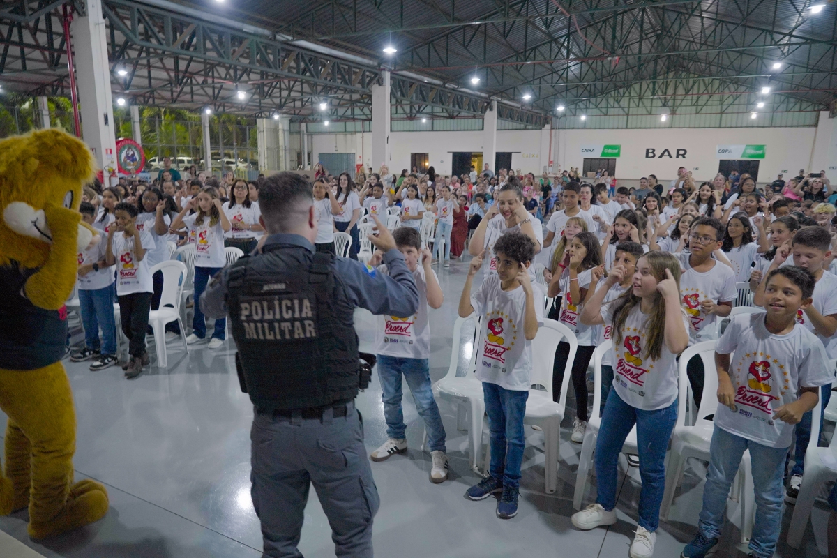 Para finalizar a cerimônia, os estudantes cantaram e realizaram a coreografia da Canção do Proerd junto com o mascote do programa, o leão Daren.